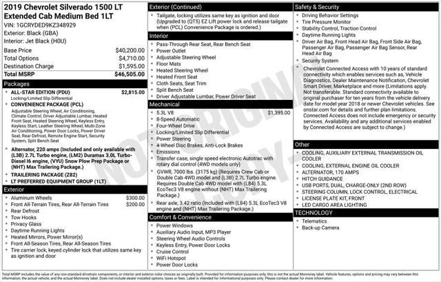 Priced below KBB Fair Purchase Price! 2019 Black Chevrolet Silverado 1500 LT EcoTec3 5.3L V8 4WD This Chevrolet Silverado 1500 has many features and is well equipped including, 10-Way Power Driver Seat w/Lumbar, 12-Volt Rear Auxiliary Power Outlet, 2 USB Ports (First Row), 4-Way Manual Driver Seat Adjuster, 4.2 Diagonal Color Display Driver Info Center, 40/20/40 Front Split-Bench Seat, All-Star Edition, Bluetooth® For Phone, Chevrolet Connected Access, Chevrolet w/4G LTE, Chrome Grille, Chrome Mirror Caps, Color-Keyed Carpeting Floor Covering, Compass, Convenience Package, Deep-Tinted Glass, Dual-Zone Automatic Climate Control, Electric Rear-Window Defogger, Electrical Lock Control Steering Column, Electronic Cruise Control, EZ Lift Power Lock & Release Tailgate, Front Frame-Mounted Black Recovery Hooks, Front Rubberized Vinyl Floor Mats, Heated Driver & Front Passenger Seats, Heated Steering Wheel, Heavy-Duty Rear Locking Differential, Hitch Guidance, Keyless Open & Start, Leather Wrapped Steering Wheel, LED Cargo Area Lighting, Locking Tailgate, Manual Tilt Wheel Steering Column, Manual Tilt/Telescoping Steering Column, OnStar & Chevrolet Connected Services Capable, Power Door Locks, Power Front Windows w/Driver Express Up/Down, Power Front Windows w/Passenger Express Down, Power Rear Windows w/Express Down, Preferred Equipment Group 1LT, Rear 60/40 Folding Bench Seat (Folds Up), Rear Dual USB Charging-Only Ports, Rear Rubberized-Vinyl Floor Mats, Rear Vision Camera, Remote Keyless Entry, Remote Vehicle Starter System, Single-Zone Manual/Semi-Automatic Air Conditioning, Steering Wheel Audio Controls, Theft Deterrent System (Unauthorized Entry), Trailering Package, Urethane Steering Wheel.