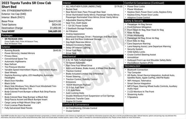 Recent Arrival! 2023 Ice Cap Toyota Tundra SR 3.4L V6 4WD This Toyota Tundra has many features and is well equipped including, 22 Gallon Fuel Tank, Cold Weather Package Delete, Front Fog & Driving Lamp Delete, Front Spoiler Delete, Parking Support Alert/Brake Delete, SR Package, Towing Package Delete, Windshield Deicer Delete.