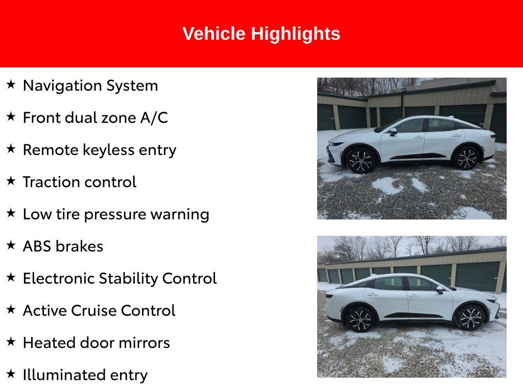 Certified. Recent Arrival! 2024 Oxygen White Toyota Crown Limited 2.5L 4-Cylinder DOHC AWD ABS brakes, Active Cruise Control, Alloy wheels, Compass, Electronic Stability Control, Front dual zone A/C, Heated door mirrors, Heated front seats, Heated rear seats, Illuminated entry, Leather Seat Trim, Low tire pressure warning, Navigation System, Remote keyless entry, Traction control.