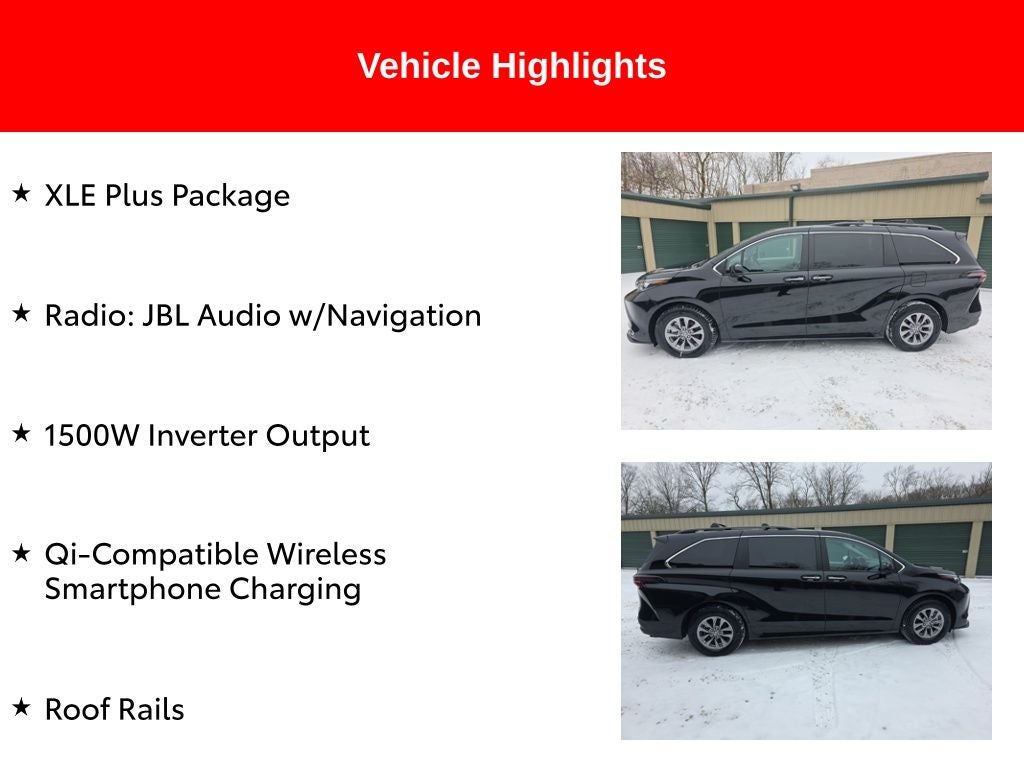 Certified. Recent Arrival! 2024 Midnight Black Metallic Toyota Sienna XLE 2.5L I4 AWD This Toyota Sienna has many features and is well equipped including, 1500W Inverter Output, Qi-Compatible Wireless Smartphone Charging, Radio: JBL Audio w/Navigation, Roof Rails, XLE Plus Package.