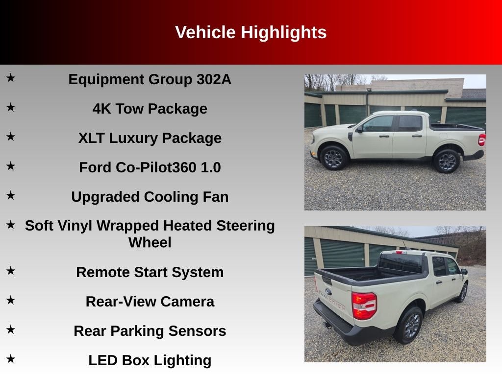 Recent Arrival! 2025 Desert Sand Ford Maverick XLT EcoBoost 2.0L I4 GTDi DOHC Turbocharged VCT AWD This Ford Maverick has many features and is well equipped including, 400W Inverter w/USB Console Rear, 4K Tow Package, Auto High Beams, BLIS w/Cross-Traffic Alert, Cross Traffic Brake Assist, Equipment Group 302A, Evasive Steering Assist, Ford Co-Pilot360 1.0, Heated Mirror w/Painted Black Skull Caps, Heated Seats, Intersection Assist, Lane-Keeping System, LED Box Lighting, Power Glass Manual-Folding Mirrors, Pre-Collision Assist w/Automatic Emergency Braking, Rear Parking Sensors, Rear-View Camera, Remote Start System, Soft Vinyl Wrapped Heated Steering Wheel, Trailer Brake Controller, Trailer Hitch (Class III) 2 Receiver, Transmission Oil Cooler, Upgraded Cooling Fan, XLT Luxury Package.