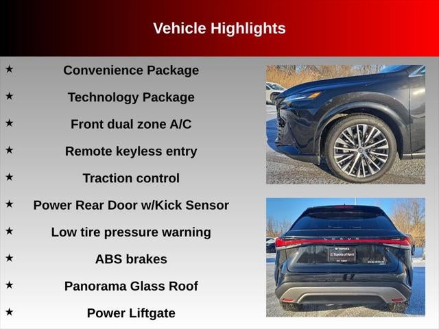 2025 Caviar Lexus RX 350h Premium Plus 2.5L I4 DOHC 16V AWD ABS brakes, Active Cruise Control, Alloy wheels, Compass, Convenience Package, Electronic Stability Control, Front dual zone A/C, Heated & Ventilated Front Bucket Seats, Heated door mirrors, Heated front seats, Illuminated entry, Leather Seat Trim, Low tire pressure warning, Panorama Glass Roof, Power Liftgate, Power Rear Door w/Kick Sensor, Remote keyless entry, Technology Package, Traction control.